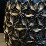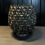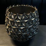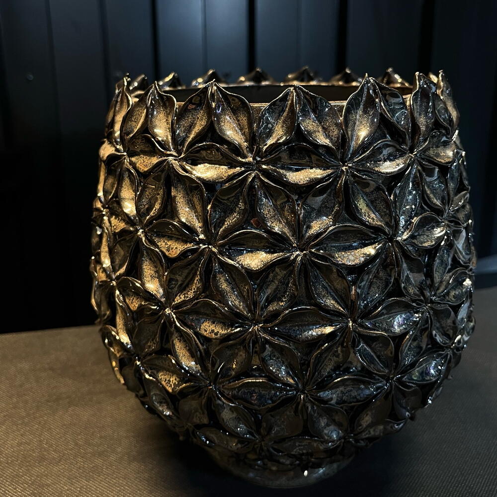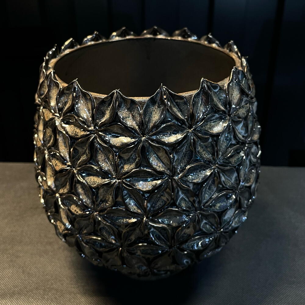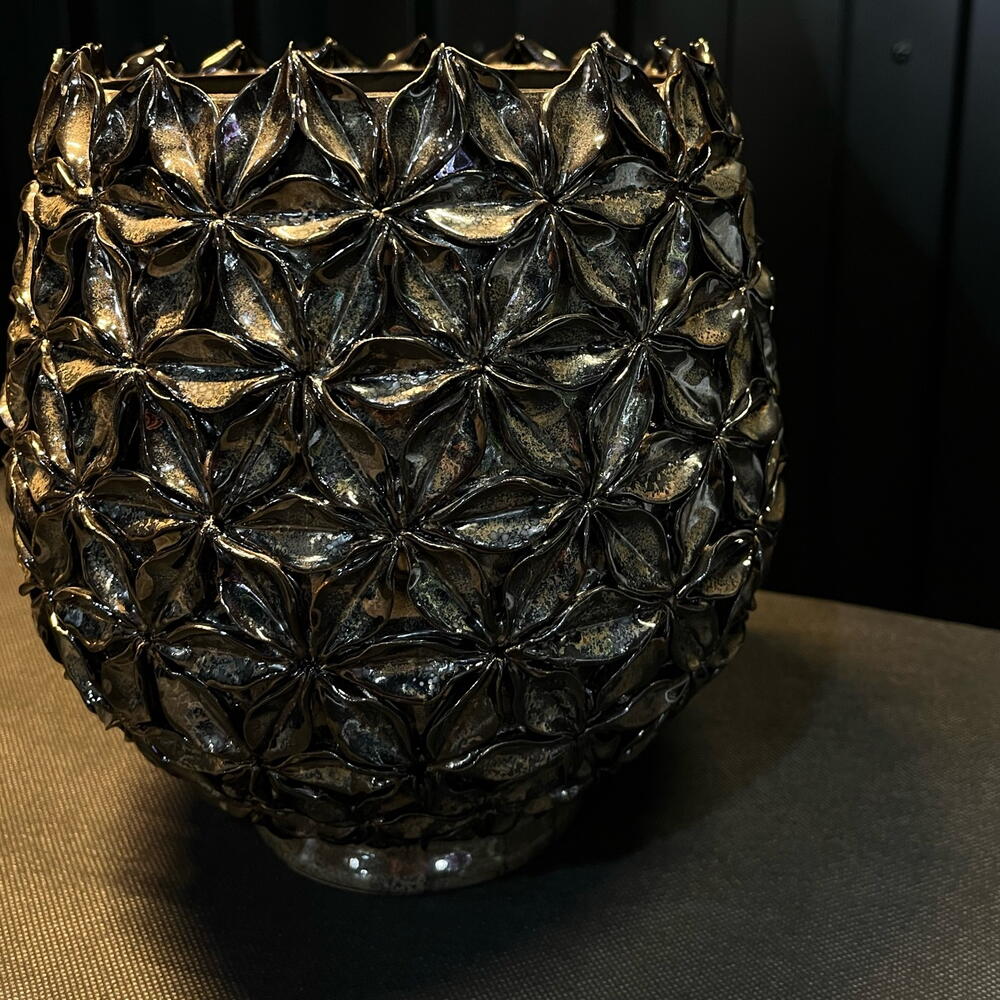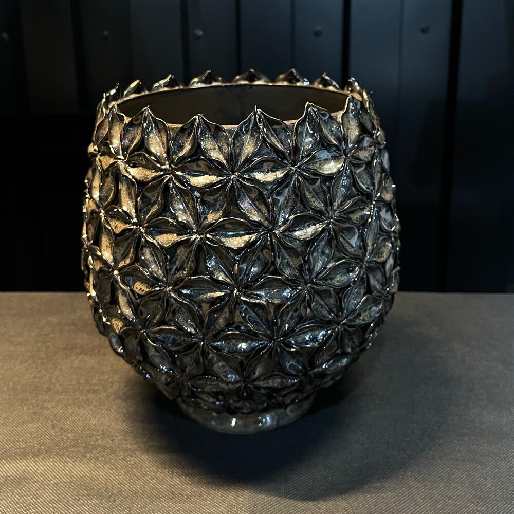 Jarrón decorativo con diseño esférico y textura en relieve formada por pequeñas flores geométricas. Su acabado metalizado aporta brillo y sofisticación, convirtiéndolo en una pieza perfecta para arreglos florales elegantes o como elemento decorativo por sí solo. Ideal para espacios modernos, interiores de lujo o como pieza protagonista en cualquier ambiente.
