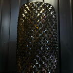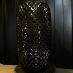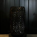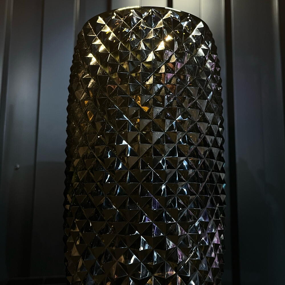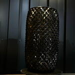 Un jarrón negro de diseño impactante, con una textura geométrica de rombos que refleja la luz como pequeñas gemas. Su acabado brillante y su forma elegante lo convierten en una pieza moderna y sofisticada, perfecta para dar un toque de lujo y misterio a cualquier espacio.