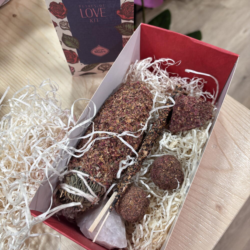 Ритуал любви, идеален для активации любви к себе и к другим. Содержит: 1 пучок для окуривания из роз, 2 бомбочки из лепестков розы и ладана, 1 маленький треугольник из розы и ладана, 1 амулет из розового кварца, 2 благовония из розы и ладана, и объяснительный диптих.