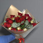 Гурманский и вкусный букет из красных роз и конфет Ferrero Rocher.