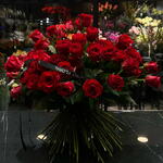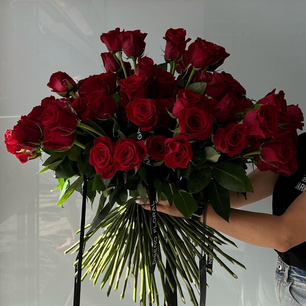 Este ramo es una explosión elegante de rosas rojas, todas reunidas en un bouquet grande y lleno de presencia. Las flores parecen alinearse con seguridad, como un conjunto que sabe que llama la atención por su color intenso y su forma impecable. Un arreglo que no necesita exagerar para destacar: simplemente impresiona. 🌹✨