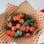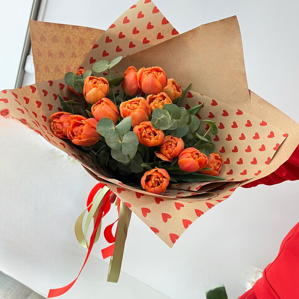 Элегантный и светлый букет из 15 оранжевых тюльпанов с нежным эвкалиптом, завернутый в натуральную крафт-бумагу и украшенный деталью в форме сердца. Тёплый и современный подарок, который с первого взгляда передаёт радость, заботу и волнение🧡