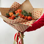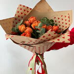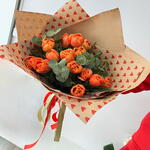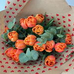 эвкалипт цинерея - 3 шт. tulipanes naranjas - 15 шт. красная лента - 70 см зелёная лента - 70 см крафт-бумага с сердечками - 2 шт.