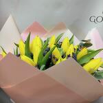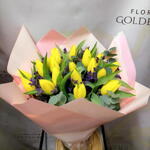 Eucalyptus - 3 шт. желтые тюльпаны - 20 шт. декоративная упаковка - 2 шт. лимониум или синяя статица - 5 шт.