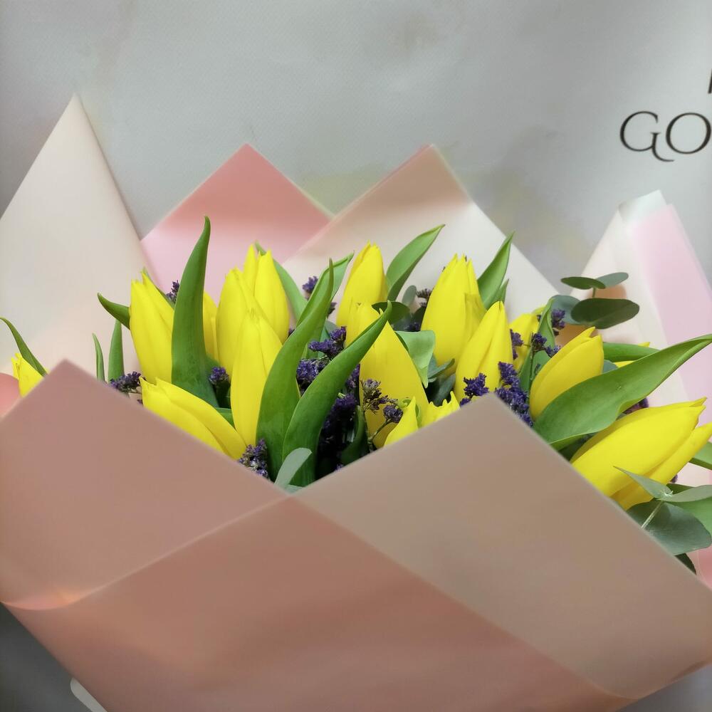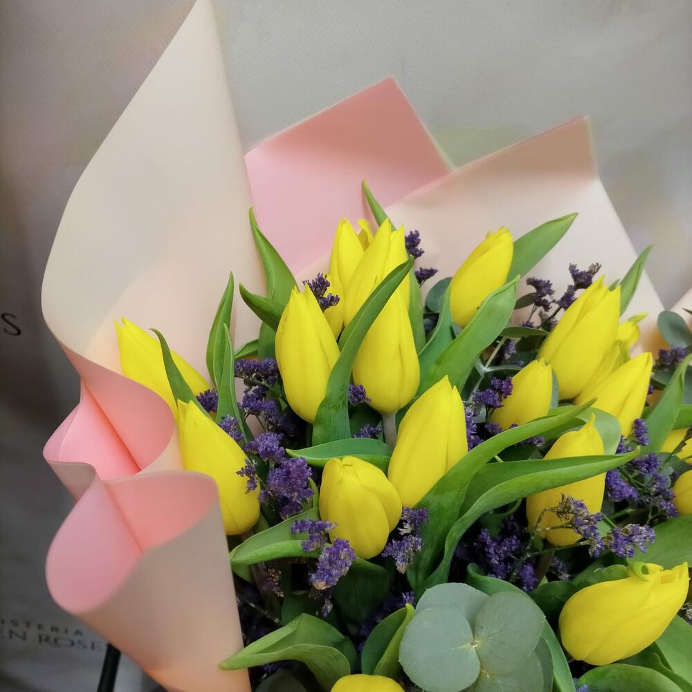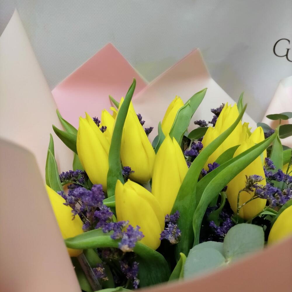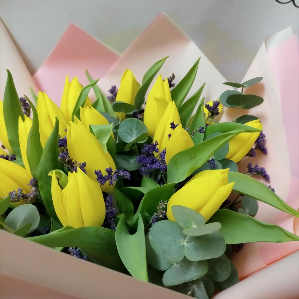 Eucalyptus - 3 шт. желтые тюльпаны - 20 шт. декоративная упаковка - 2 шт. лимониум или синяя статица - 5 шт.