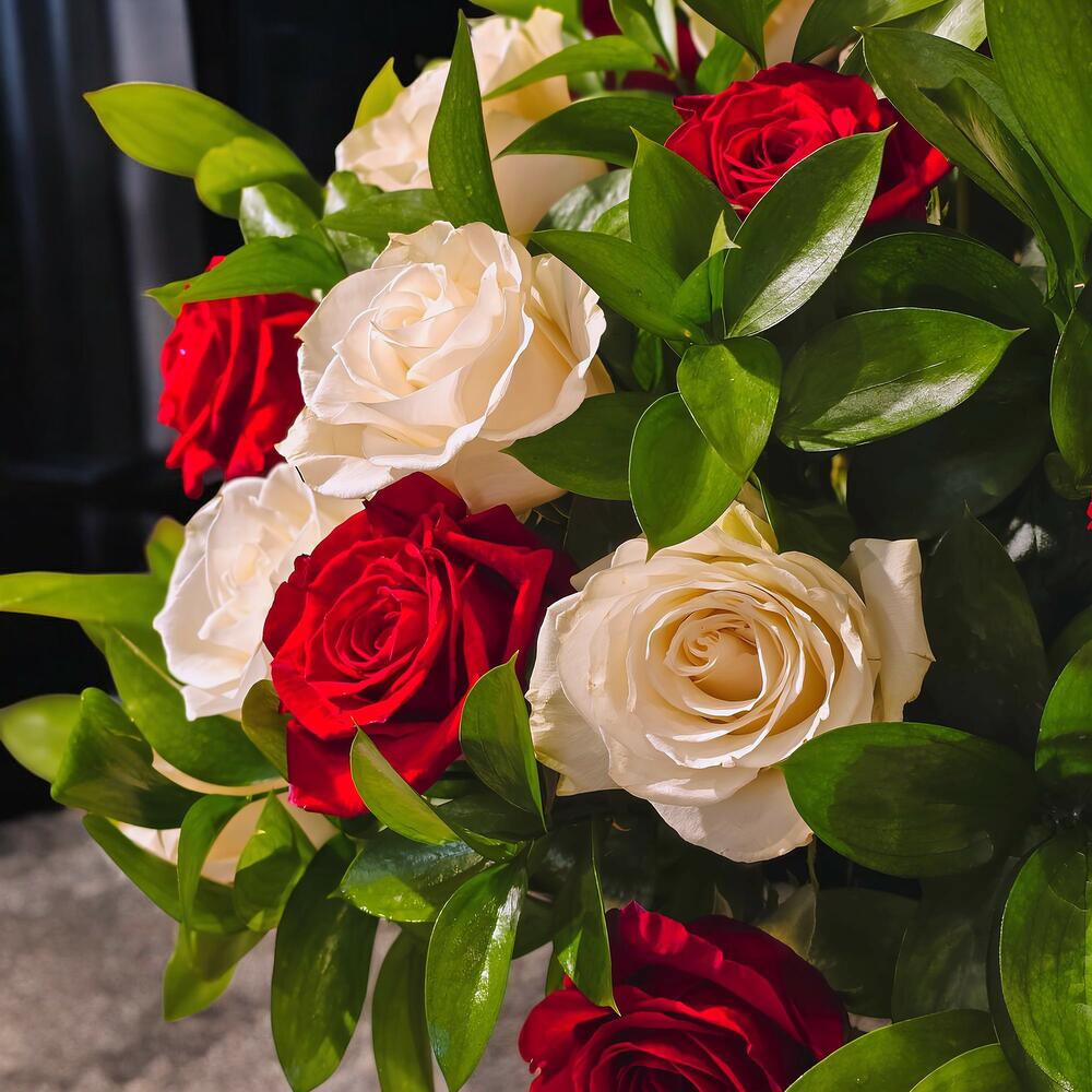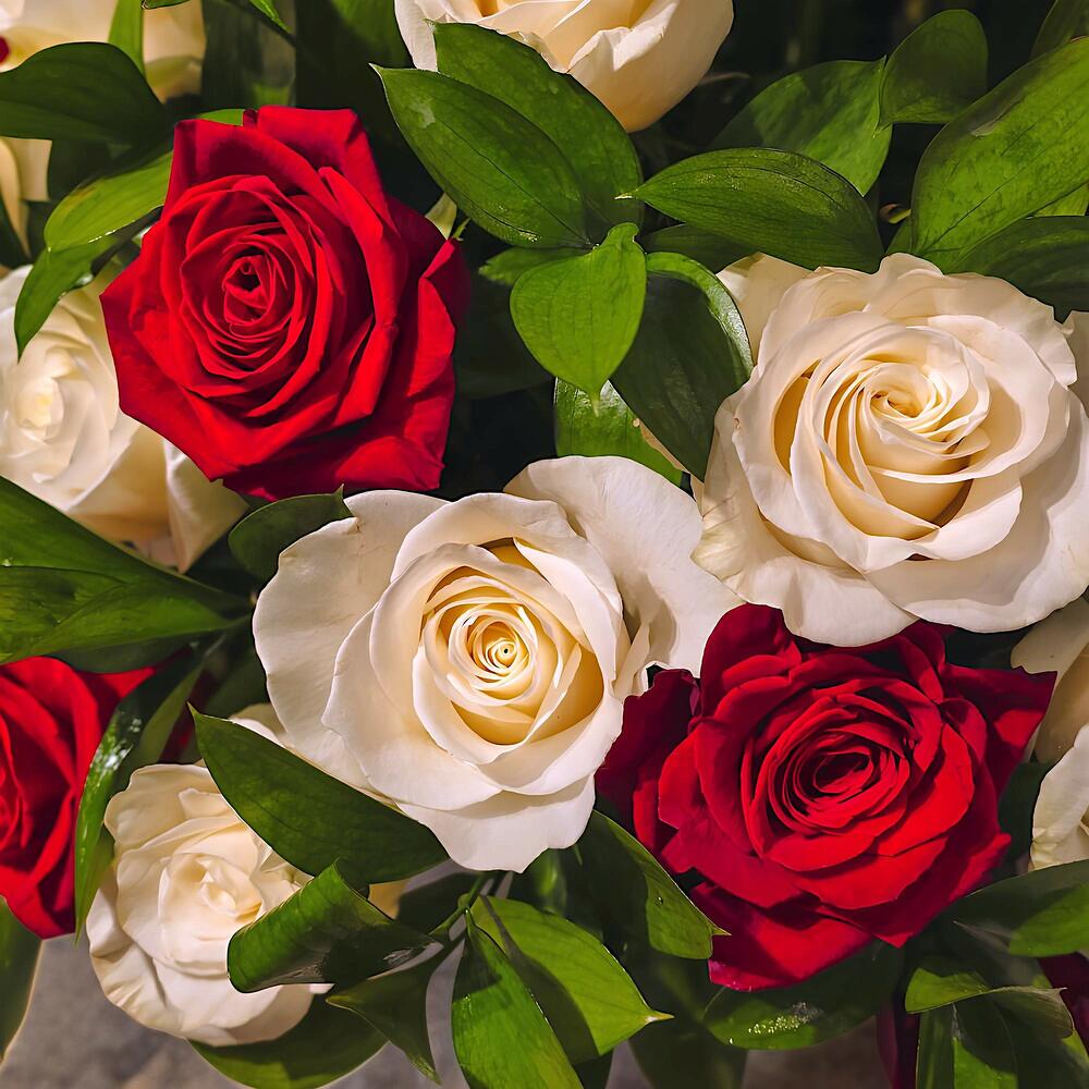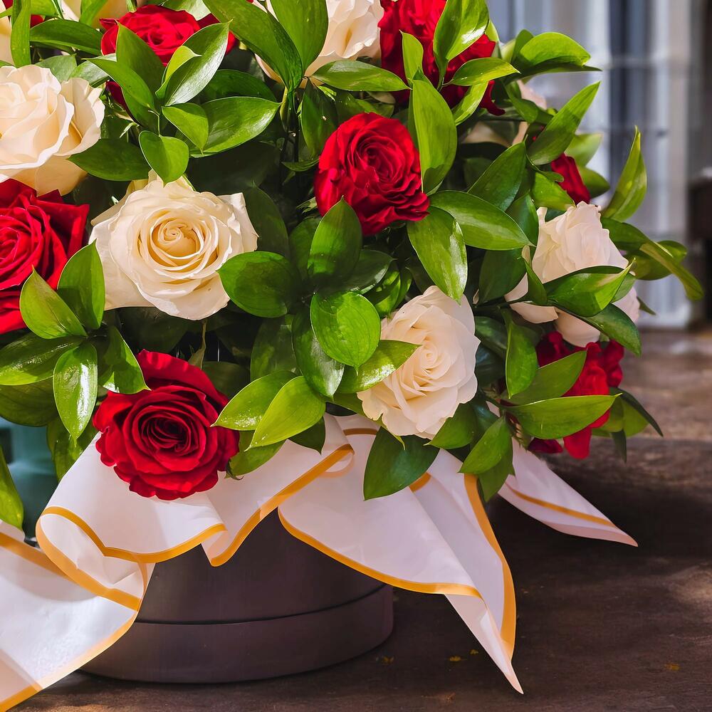 Элегантная коробка с розами к 50-летию • 25 белых роз 25 красных роз • Зеленые акценты Описание: Отпразднуйте полувековой юбилей любви и преданности с этой изысканной коробкой с розами, созданной специально для 50-летнего юбилея. Сочетание 25 красных и 25 белых роз, украшенное нежными цветами и лёгкой зеленью, символизирует страсть и чистоту вечной любви.