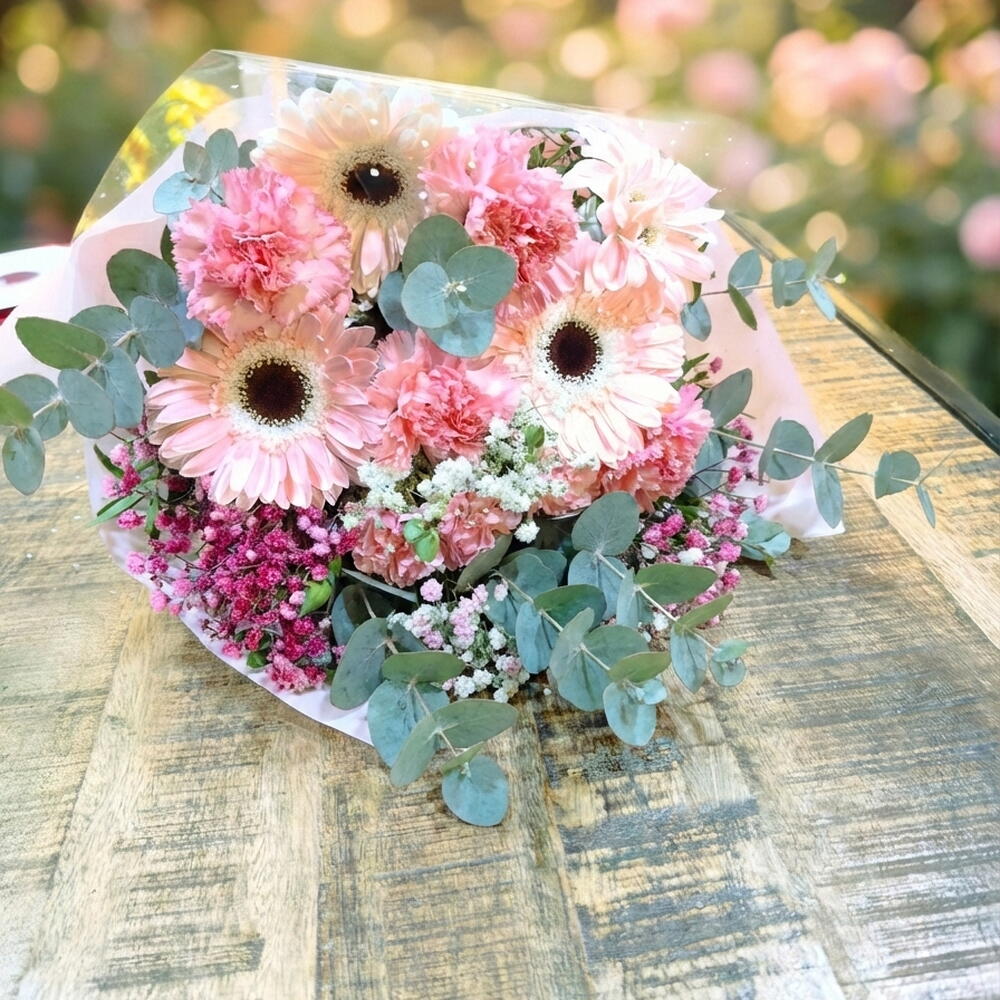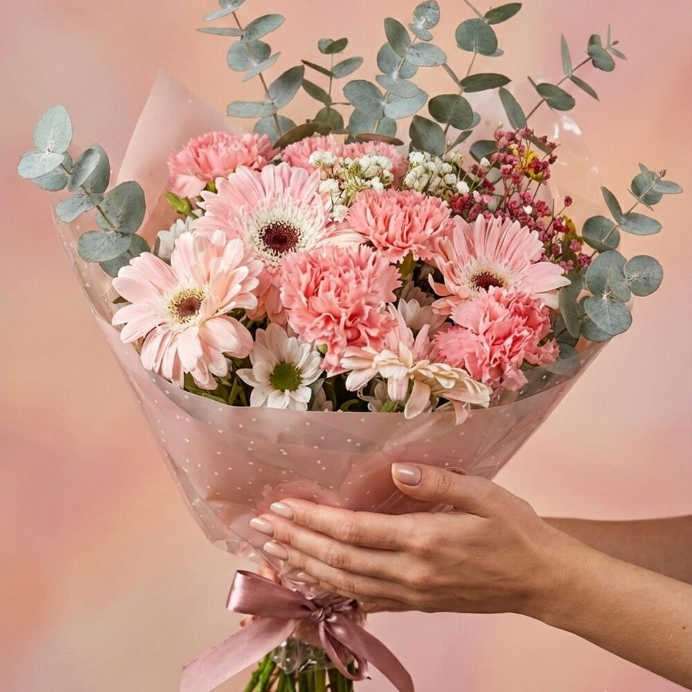 Настоящий взрыв цвета в розовых тонах, который передаёт радость, нежность и свежесть с первого взгляда. Этот букет сочетает крупные герберы, гвоздики насыщенно- и нежно-розовые, нежную гипсофилу, статицу и натуральный эвкалипт, который придаёт объём и элегантность. Это весёлый, современный и очень эффектный букет, идеальный для дней рождения, годовщин, рождений или просто чтобы удивить без повода. Его сочетание текстур и розовых оттенков создаёт романтичный и сияющий эффект, который не остаётся незамеченным. Букет, который влюбляет с первого взгляда и наполняет любое пространство жизнью и цветом 🌸✨