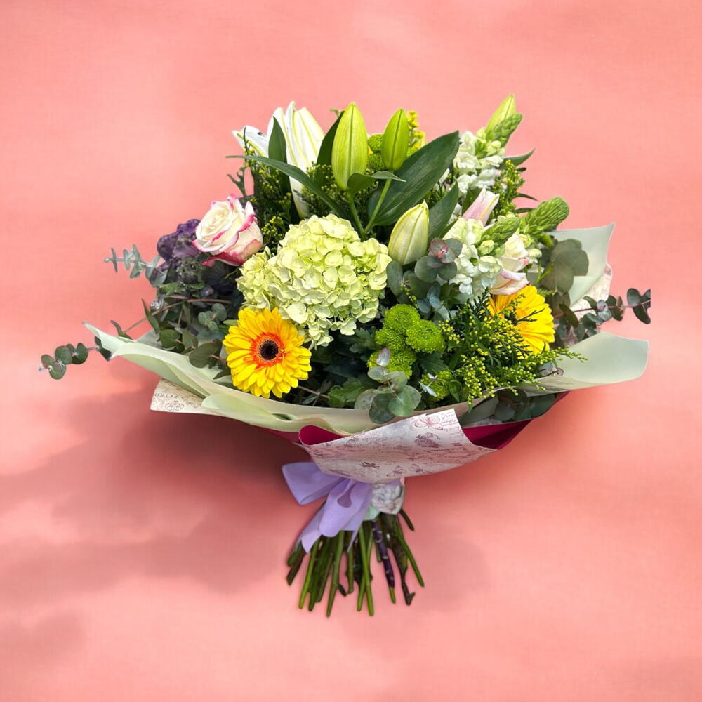 Букет «Яркий рассвет» – это взрыв ярких красок и естественной свежести, отражающий красоту нового дня. Этот букет с белыми лилиями, подсолнухами и зелёными гортензиями дарит ощущение свежести и позитивной энергии. Розовые розы и зелёные хризантемы придают композиции нежный и элегантный штрих, а эвкалипт и другие зелёные листья дополняют композицию своей нежной естественностью. Этот букет идеально подходит для украшения любого помещения или в качестве подарка по особым случаям, таким как день рождения, годовщина или любое другое торжество любви и благодарности. Мягкая бумажная упаковка и фиолетовая лента придают букету изысканность, ещё больше подчёркивая его красоту. «Яркий рассвет» – идеальный подарок для тех, кто хочет дарить радость и позитивную энергию через цветы.