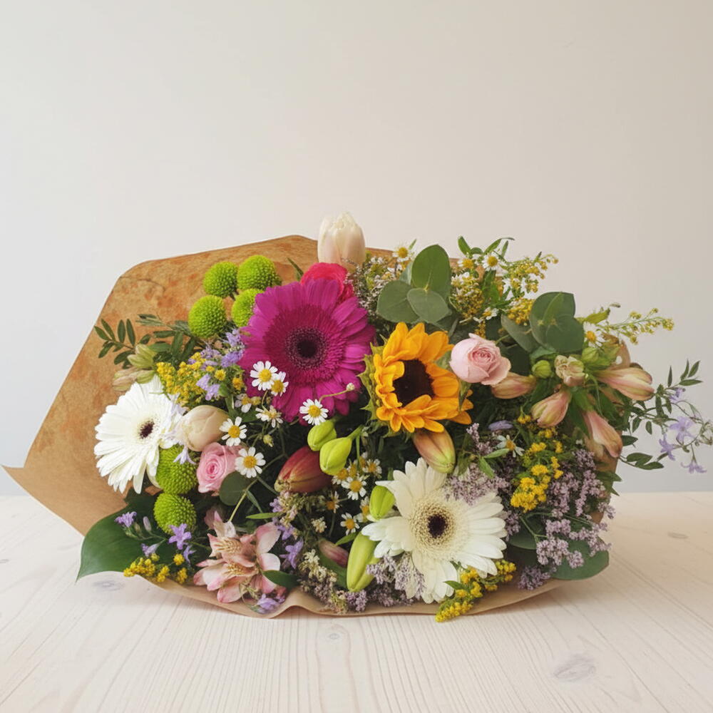 Этот прекрасный букет полон свежести, радости и цвета, идеален для того, чтобы озарить любое особое событие. Сочетание подсолнухов, гербер и ромашек создаёт яркий контраст, который вдохновляет на оптимизм и дарит энергию. Нежные розовые розы и тюльпаны придают романтичный и элегантный оттенок, в то время как зелёная листва естественно уравновешивает композицию. Это идеальный подарок на день рождения, в знак благодарности или просто чтобы удивить кого-то дорогого. Каждый цветок был тщательно отобран, чтобы гарантировать свежесть и визуальную гармонию. Этот букет не только украшает, но и передаёт эмоции и добрые пожелания.