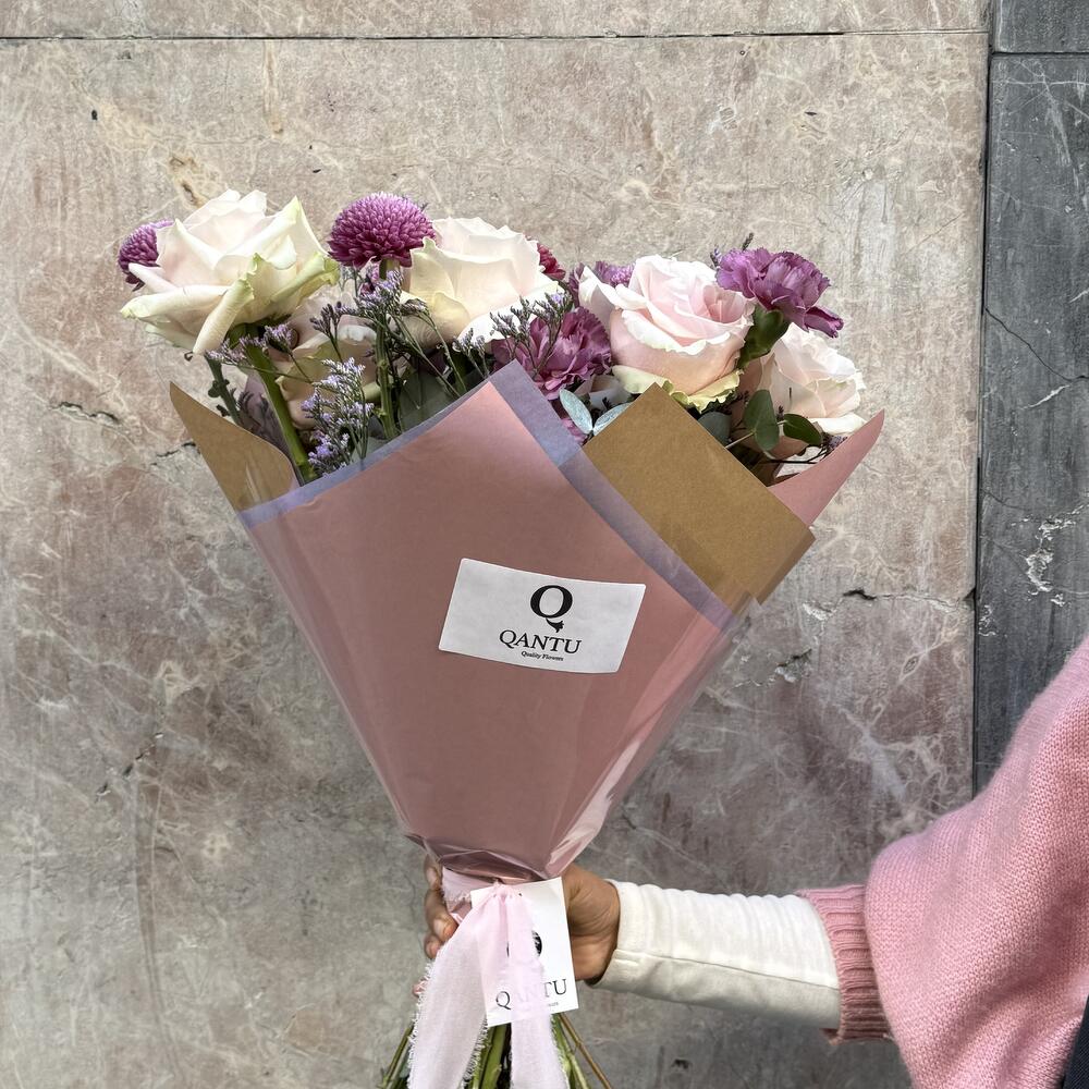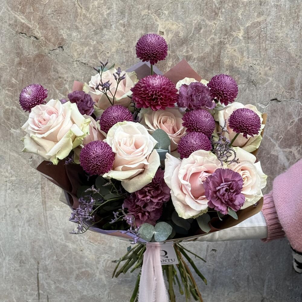 Эта фирменная цветочная композиция состоит из 12 нежных розовых роз, которые придают композиции нотку элегантности и изысканности. Пять кремонов контрастируют с утончённостью роз и создают эффектный визуальный эффект. Семь гвоздик (диантусов) усиливают аромат, а три лимониума добавляют нотку дикой природы. Этот великолепный букет — идеальный способ выразить глубокую и искреннюю любовь. Идеально подходит для праздников, особых случаев или просто для того, чтобы украсить любое повседневное пространство.