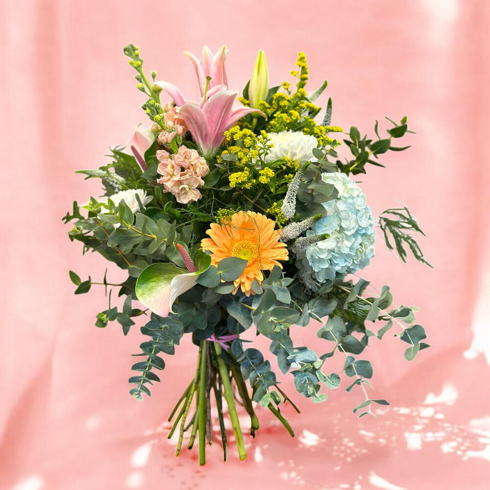 Букет «Цветочный закат» – это симфония тёплых и свежих цветов, передающих нежность и красоту идеального заката. Этот букет, состоящий из розовых лилий, оранжевых гербер и синих гортензий, очаровывает гармоничным сочетанием нежных и ярких тонов. Альстромерии и ветки эвкалипта привносят свежесть и экзотический штрих, уравновешивая композицию. Маленькие жёлтые цветы добавляют искры света, освещая букет, а зелёные листья придают ему естественность и элегантность. «Цветочный закат» – идеальный подарок на годовщину, праздник или просто для того, чтобы сделать кому-то необычный сюрприз. Этот букет полон жизни и свежести. Его элегантный и гармоничный дизайн делает его идеальным подарком для любого особого случая.