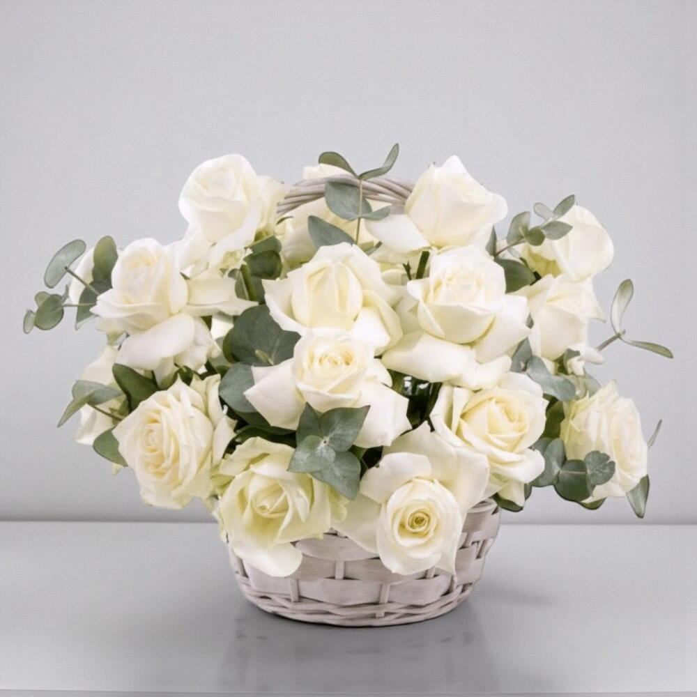 Эта элегантная композиция в корзине из белых роз воплощает чистоту, гармонию и вечную красоту. Кремово-белые бутоны создают мягкий и роскошный вид, а свежий эвкалипт добавляет естественную текстуру и тонкий, успокаивающий аромат. Размещённая в очаровательной плетёной корзине, композиция выглядит уютно, но при этом изящно, что делает её идеальной для свадеб, годовщин, новоселья или искренних поздравлений. Розы тщательно подобраны, чтобы создать пышную, сбалансированную форму, которая впечатляет с любого ракурса. Эта композиция приносит ощущение покоя и утончённости в любой интерьер. Чтобы цветы дольше сохраняли свежесть, ставьте корзину в прохладное место, вдали от прямых солнечных лучей, и регулярно подливайте свежую воду в флористическую пену.
