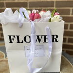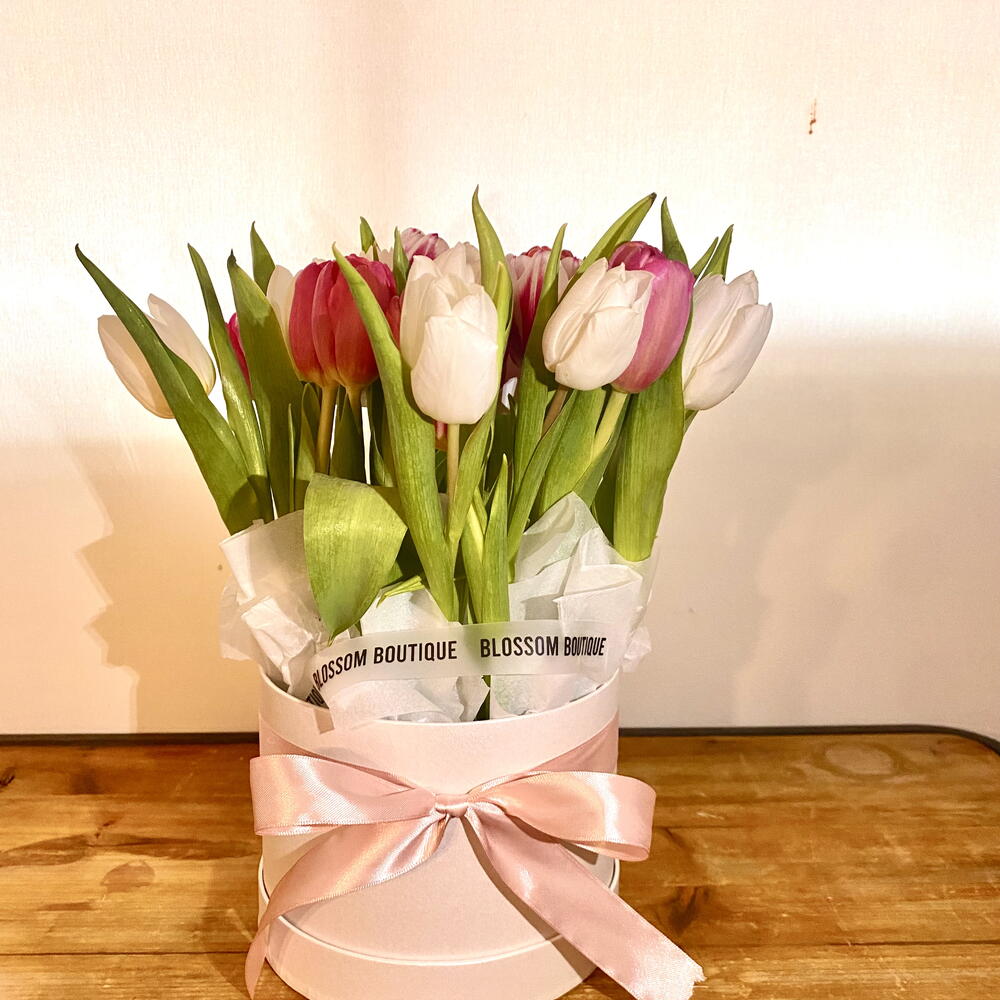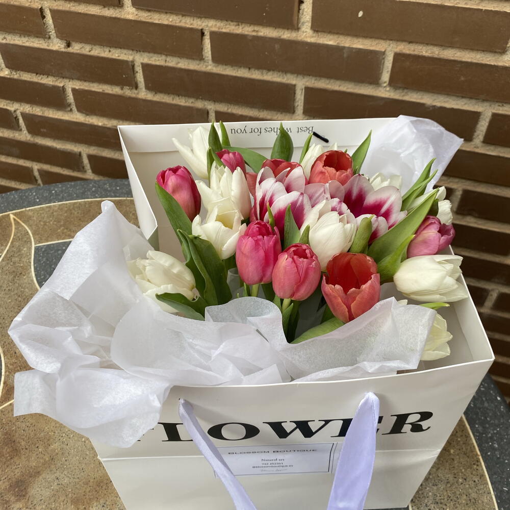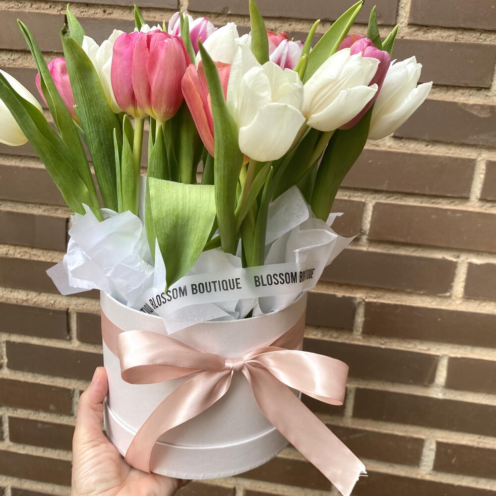 карточка с посвящением - 1 шт. papel de seda blanco - 3 шт. белые и розовые тюльпаны - 11 шт. круглая белая перламутровая коробка - 1 шт. против и бант - 1 шт. сумка типа коробки “цветы” - 1 шт.