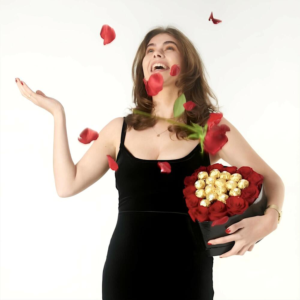Эта элегантная цветочная композиция, состоящая из 12 ярких красных роз и 16 неотразимых Ferrero Rocher, является идеальным сочетанием романтики и сладости. Изысканный подарок, чтобы показать свою любовь и признательность по любому поводу.