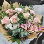 Statice - 5 шт. Lisianthus - 4 шт. eucalipto - 5 шт. белые ромашки - 4 шт. розы Эквадора - 7 шт. piatacia - 4 шт.