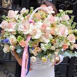 Spray rose - 10 шт. Basket - 1 шт. Lisianthus - 10 шт. rose - 15 шт. clove - 10 шт. matthiola - 10 шт. eucalipthus - 5 шт.