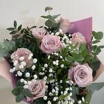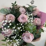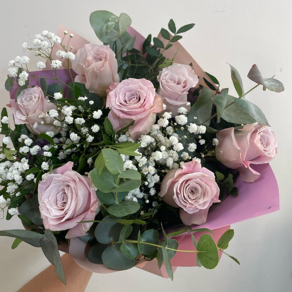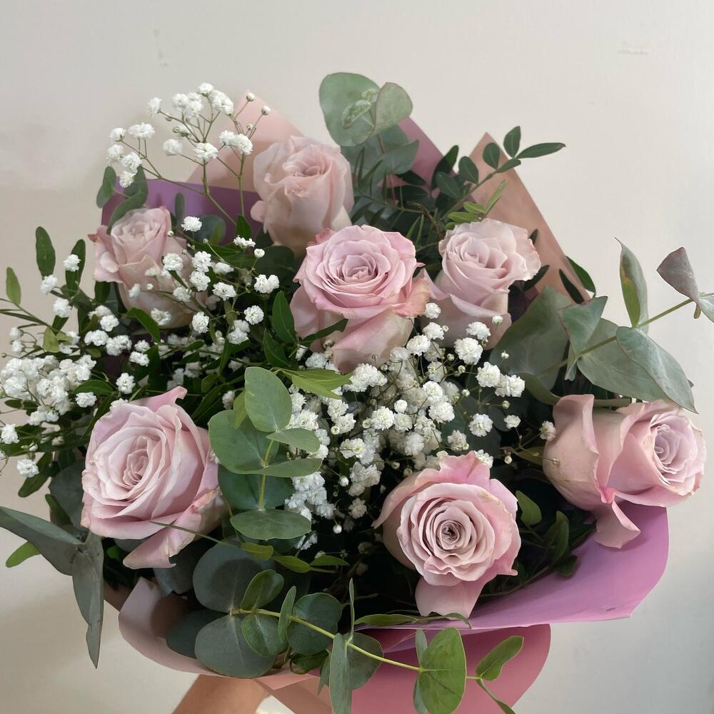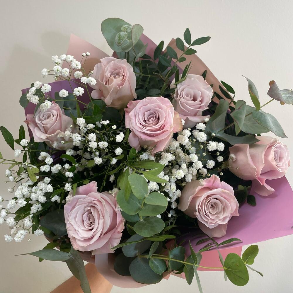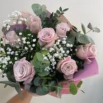 белая гипсофила - 2 шт. декоративная зелень (листва) - 1 шт. розы пастельно-розовые или двухцветные - 7 шт.