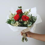 Этот элегантный букет красных роз — классический символ любви, уважения и глубоких чувств. Три насыщенно-красные розы занимают центральное место, прекрасно дополненные нежными белыми цветами и свежими листьями эвкалипта. Мягкая белая упаковка подчеркивает естественную красоту цветов, придавая букету легкость, воздушность и современный вид. Идеально подходит для романтических жестов, годовщин, дней рождения или значимых подарков в знак благодарности, эта композиция одновременно стильная и трогательная. Компактный размер позволяет легко преподнести букет, при этом он выглядит изысканно и выразительно. Чтобы букет дольше оставался свежим, поместите его в чистую воду, подальше от прямых солнечных лучей. Регулярно меняйте воду и слегка подрезайте стебли каждые два дня.