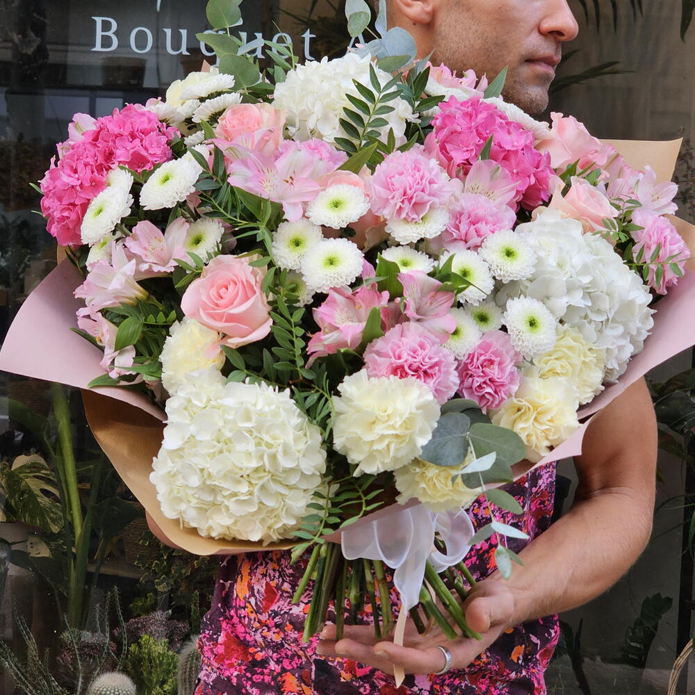 hortensia - 6 шт. alstrameria - 7 шт. rosa holanda - 7 шт. clavel mix - 15 шт. chrisantema botón - 5 шт.
