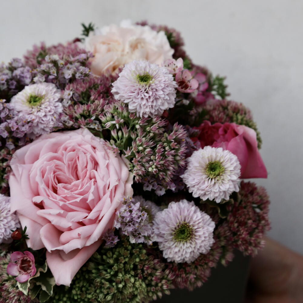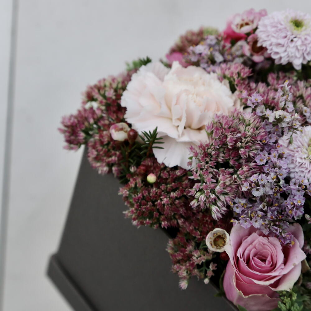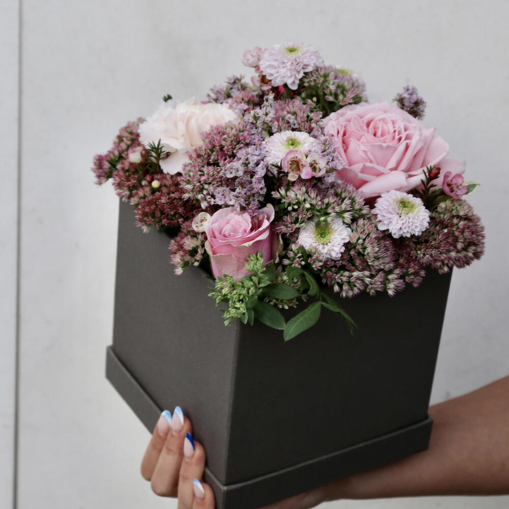 Box - 1 шт. Limonium - 1 шт. Sedum - 4 шт. santini - 1 шт. rosa - 3 шт. clavel - 1 шт. chamelacium - 1 шт.