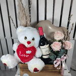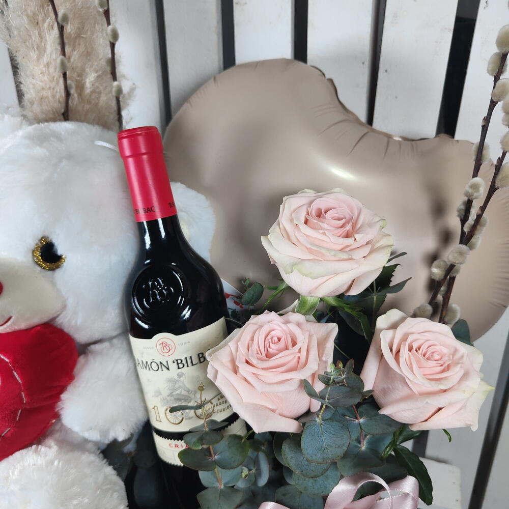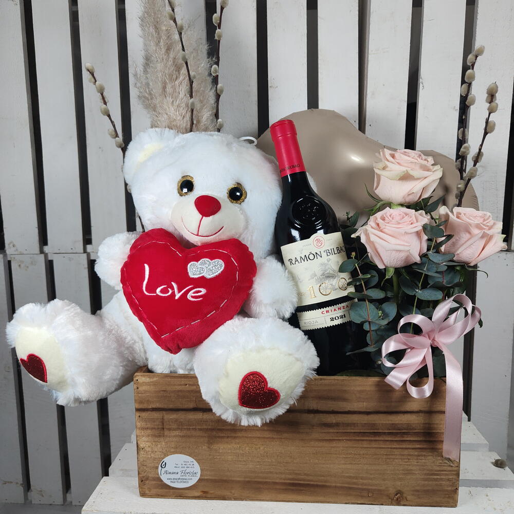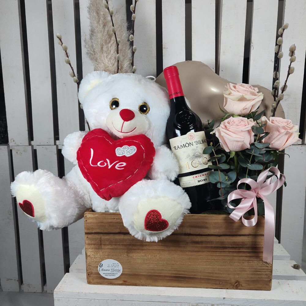 rosas - 3 шт. salix - 3 шт. флористическая губка - 2 шт. плюшевый мишка - 1 шт. деревянная коробка - 1 шт. щетка для пыли - 1 шт. шар в форме сердца - 1 шт. вино рамон бильбао - 1 шт.