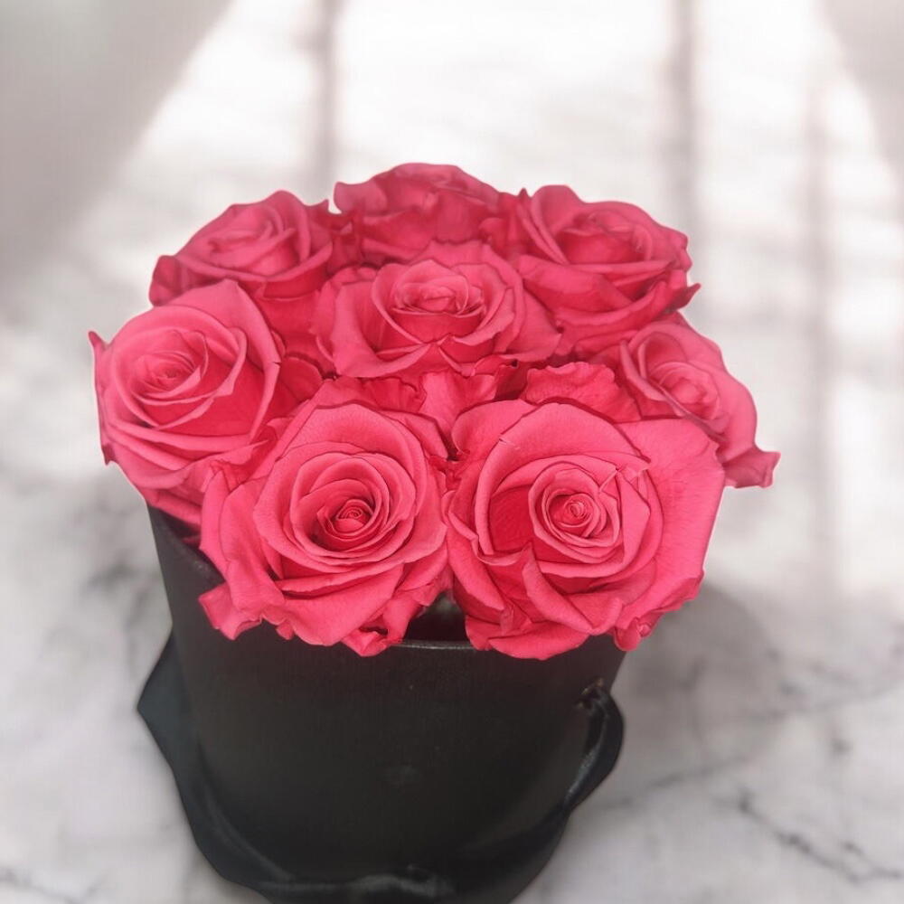 Каждая роза насыщенного розового оттенка бережно хранится, чтобы сохранить свежесть и красоту надолго, не требуя дополнительного ухода. Идеально подходит для особых случаев, таких как годовщины, дни рождения или просто для того, чтобы выразить свою любовь и благодарность. Изысканный и минималистичный дизайн делает эту розу идеальным украшением для любого помещения, от гостиной до офиса. Она добавит нотку роскоши и романтики, которая сохранится надолго. Черная коробка с розовыми стабилизированными розами.