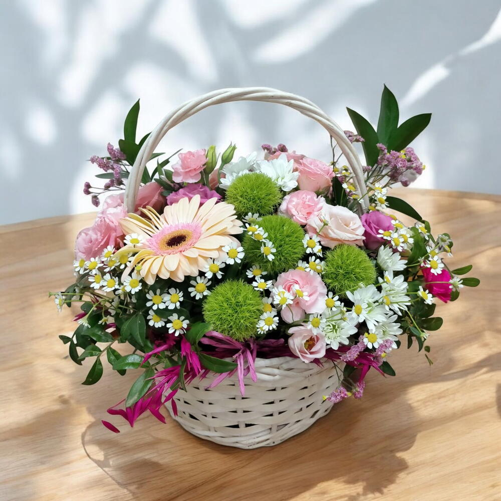 Изысканная цветочная корзина, подчёркивающая красоту и аромат прекрасного миниатюрного сада. В неё входят яркая гербера, три изысканные разветвлённые розы, три душистые маргаритки, три нежные миниатюрные гвоздики и три шаровидные хризантемы. Завершающий штрих – два элегантных лизиантуса и три веточки фисташки. Три очаровательные розовые розы дополняют композицию, делая её очаровательным и трогательным подарком на любой случай. Каждый цветок был тщательно подобран, чтобы создать потрясающее сочетание цветов и текстур.