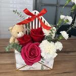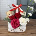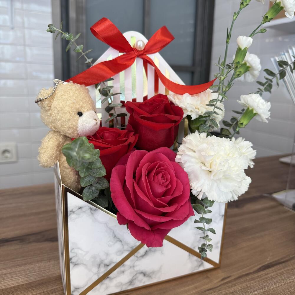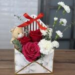 Эта очаровательная цветочная композиция состоит из 4 веточек эвкалипта, 3 изысканных роз, 2 элегантных гвоздик и 2 видов разнообразной зелени. Также она содержит милого плюшевого мишку и декоративную ленту, чтобы добавить нотку нежности и цвета. Букет также украшают 2 нежные мини-гвоздички и он отправляется на специальной картонной подставке. Идеально, чтобы отметить любое особое событие своей вызывающей воспоминания красотой и ароматом.