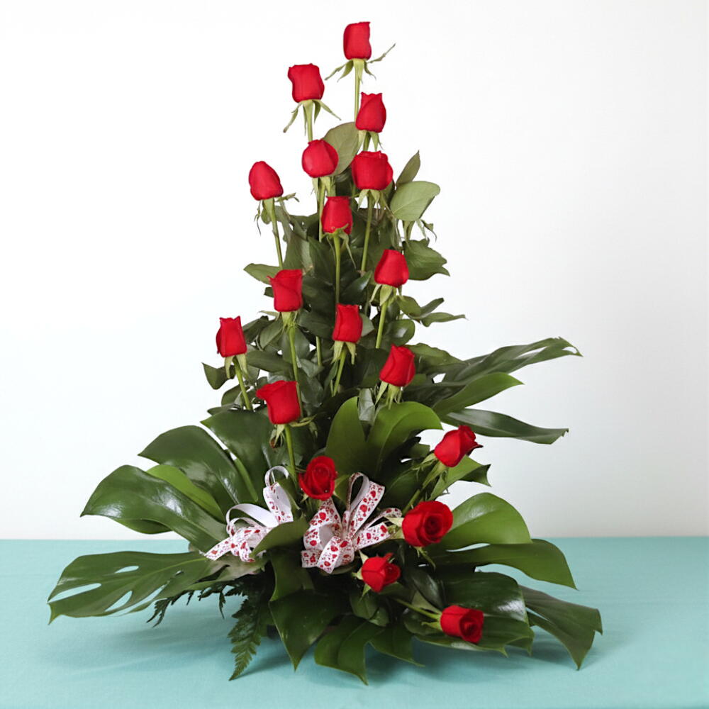 В сопровождении пышной зелёной листвы и декоративного банта этот дизайн выделяется в любой особенный момент — например на годовщины, при предложении руки и сердца или просто чтобы удивить незабываемым романтическим жестом.