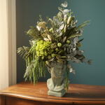 стабилизированный эвкалипт - 4 шт. керамическая композиция - 1 шт. стабилизированная зеленая гортензия - 1 шт. кремовый лагурус - 7 шт. зеленый стабилизированный амарант - 5 шт. стабилизированный цветок риса - 5 шт. стабилизированная туя - 9 шт. pali pali сохранённый - 13 шт. стабилизированный арбутус - 7 шт.