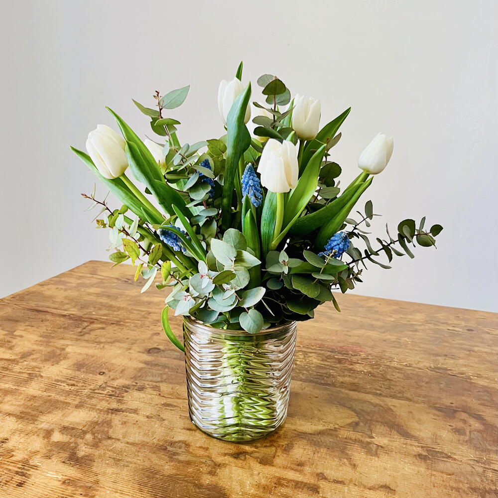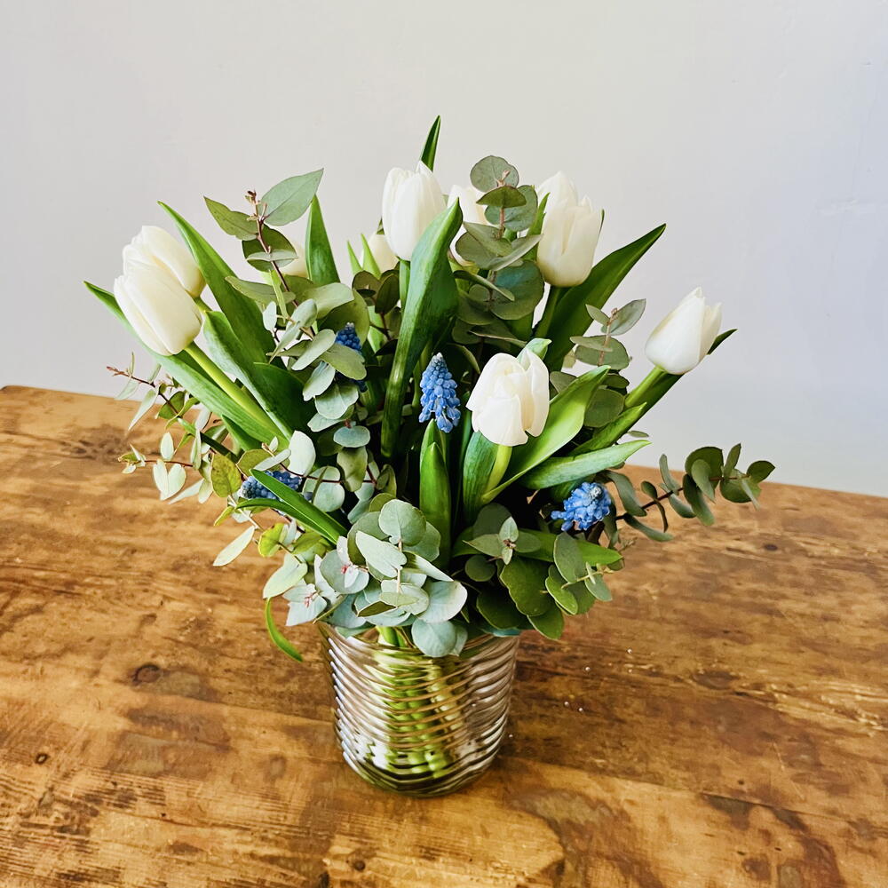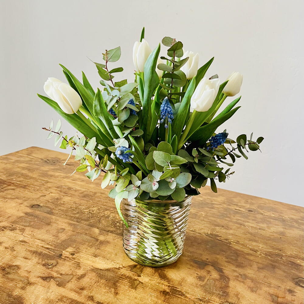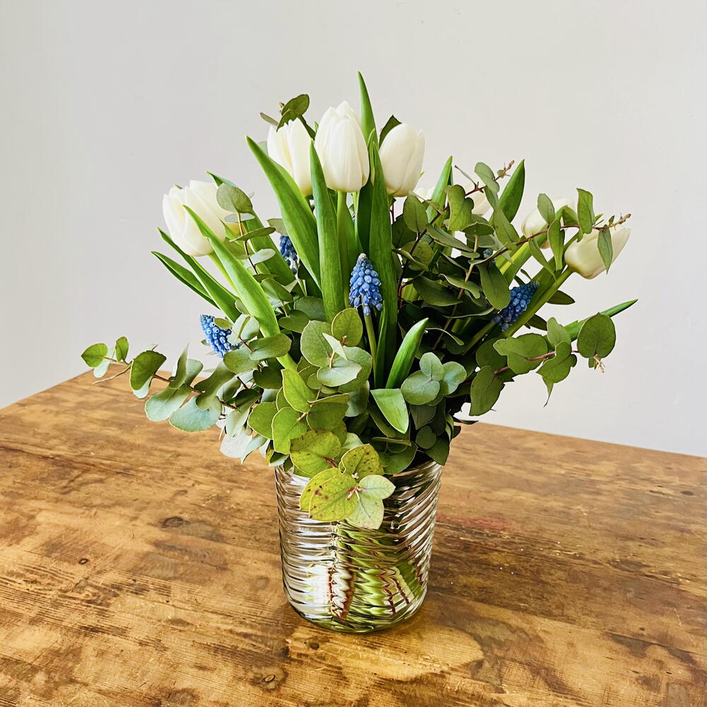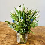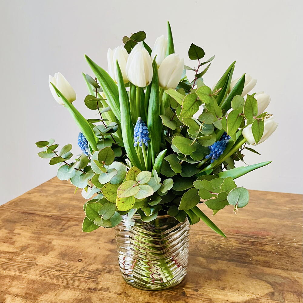 Природная красота в этой элегантной композиции из белых тюльпанов, сопровождаемых жизнерадостным средиземноморским цветом синего мускари и свежестью, привнесённой эвкалиптом. Стеклянная ваза включена