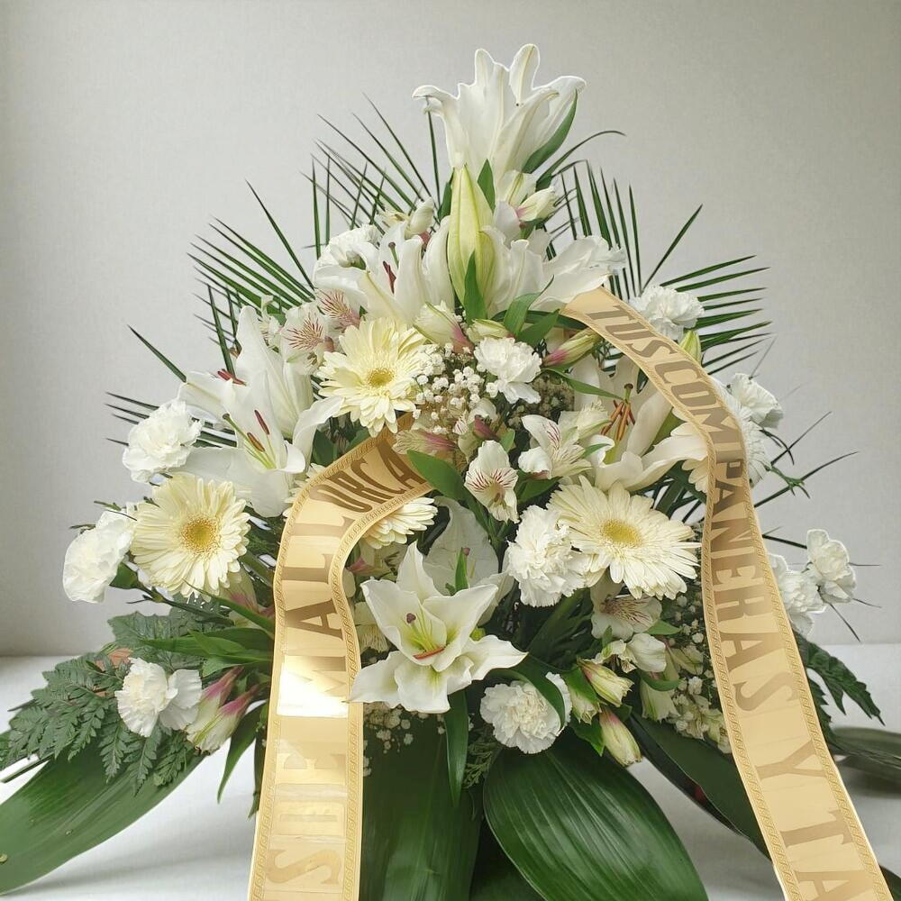 Эта элегантная траурная цветочная композиция цветочной мастерской тонко сочетает 5 восточных лилий, 7 белых гвоздик и 7 белых гербер, создавая мягкую и уважительную цветовую палитру. Включает также 4 белые альстромерии и 4 белые гипсофилы, которые придают деликатную текстуру. Дополнена 5 элементами из пальмовых листьев, аспидистры и папоротника, которые придают зелёный и натуральный акцент. Эта цветочная композиция передаёт послание мира, любви и вечной памяти и является идеальным выбором для выражения соболезнований.