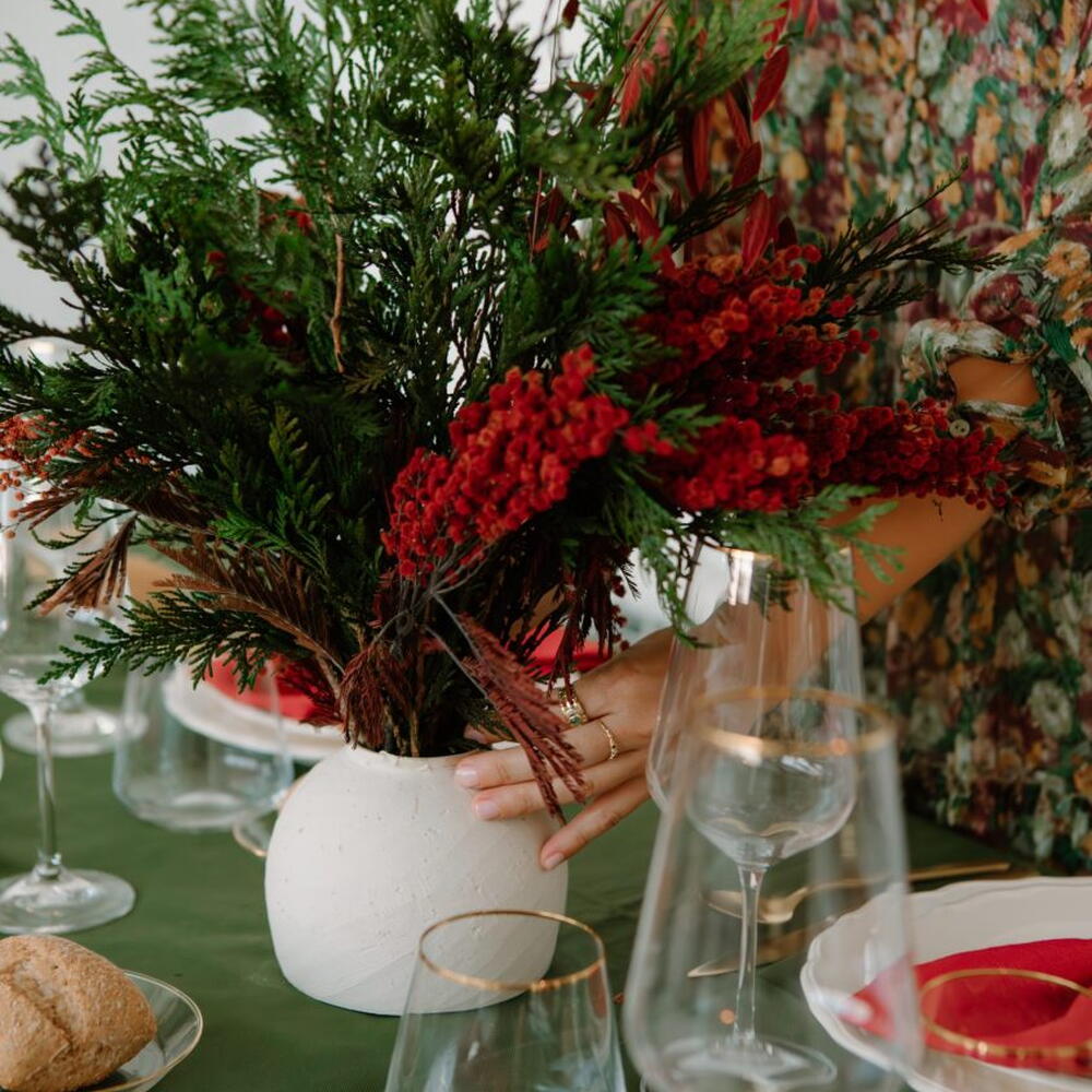 Эта композиция из стабилизированных цветов, включающая тую и красную акацию, создана вручную, чтобы украсить ваш дом естественной элегантностью во время праздников. Яркий зеленый цвет стабилизированной туи уравновешивается теплым красным цветом акации и нежным движением хасмантиума, создавая композицию, полную текстуры, контраста и характера. Ее естественная и изысканная эстетика делает ее очень востребованным элементом рождественских цветочных композиций, композиций из стабилизированных цветов и натуральных праздничных украшений. Композиция представлена в белой керамической вазе с мягкими линиями, которая подчеркивает цвета и добавляет яркости столам, буфетам или прихожим. Благодаря процессу консервации, эта композиция сохраняет свою красоту в течение длительного времени, не требуя полива или ухода, что делает ее долговечным и экологичным вариантом для рождественских украшений.