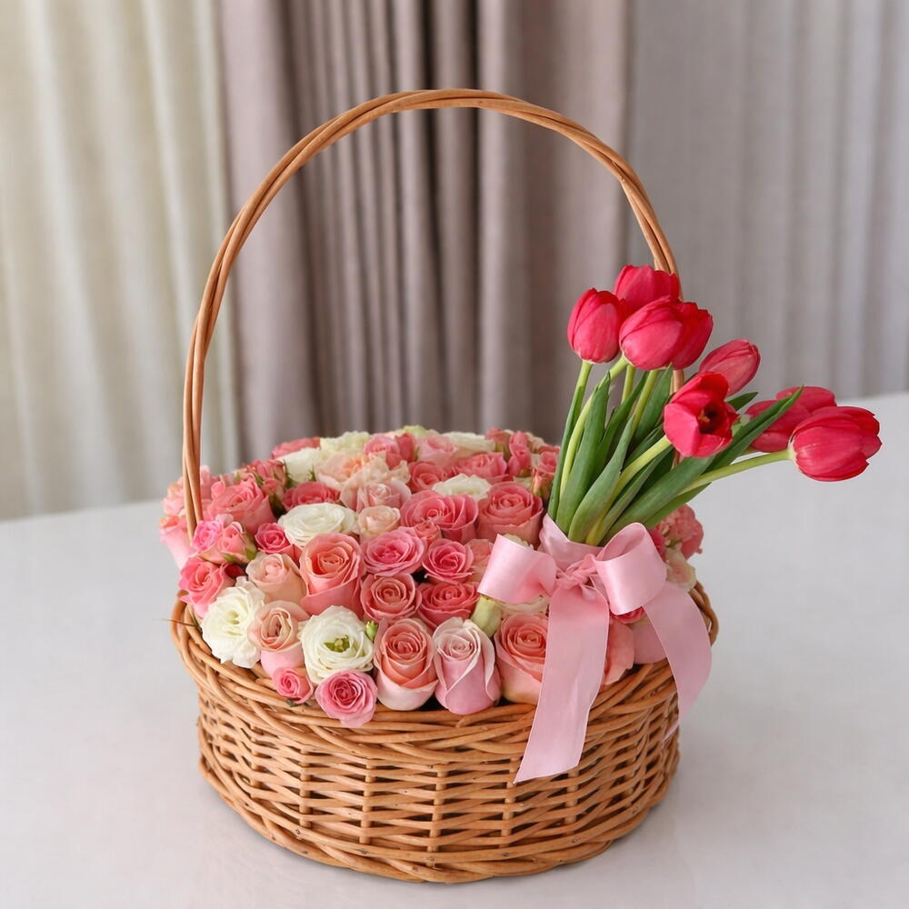 розовые тюльпаны - 10 шт. Смешанные розы - 70 шт.