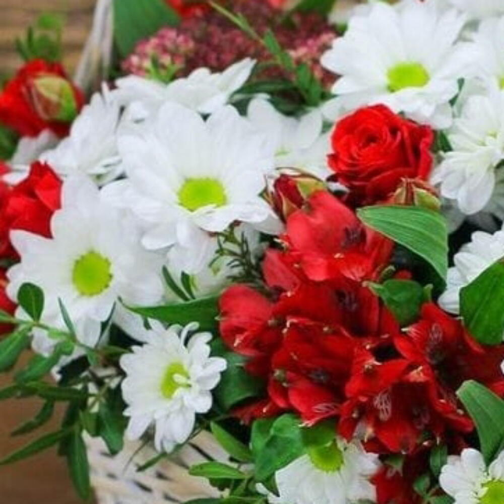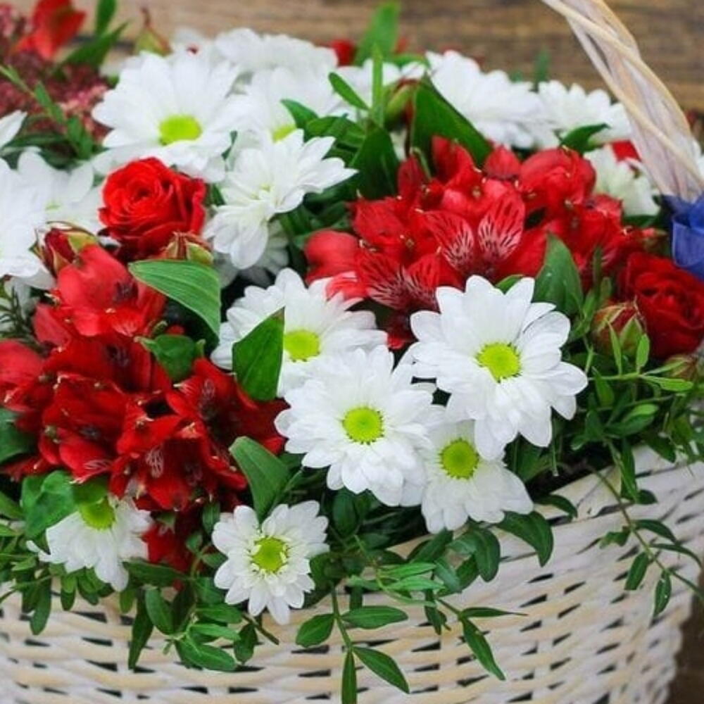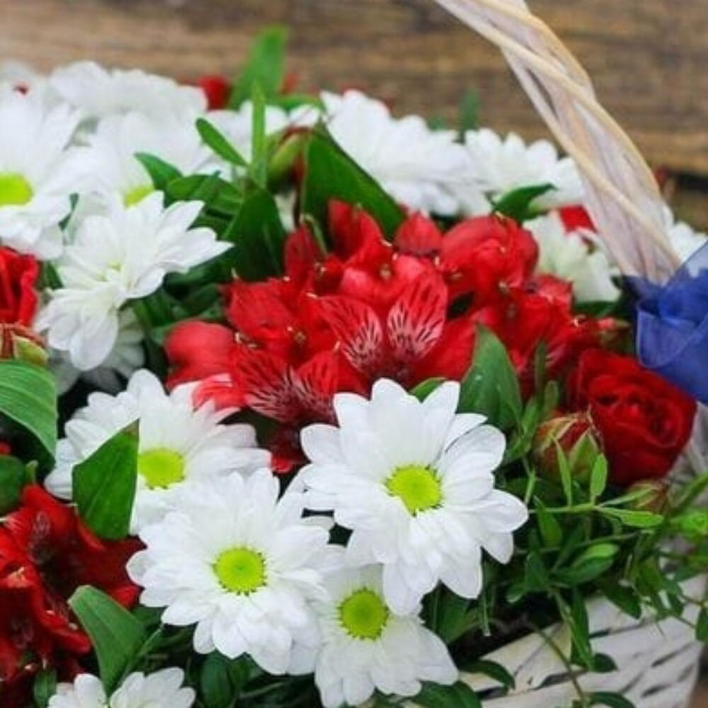 Прекрасная цветочная корзина в бело-красной гамме с букетами белых ромашек, красных альстромерий и красных роз. Удивите сегодня, и вы останетесь довольны 💐🌹🌹💐💝