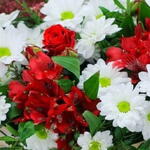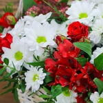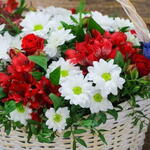 красная роза - 3 шт. разнообразная зелень - 5 шт. белые ромашки - 5 шт. корзина из лозы - 1 шт. красные альстромерии - 4 шт. гиперикум красный - 2 шт.