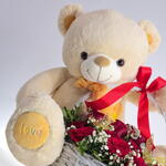 eucalipto - 3 шт. paniculata - 3 шт. rosas rojas - 12 шт. canasta - 1 шт. декоративные бабочки - 2 шт. лентиск или подобное - 3 шт. плюшевый медведь 70 см - 1 шт.