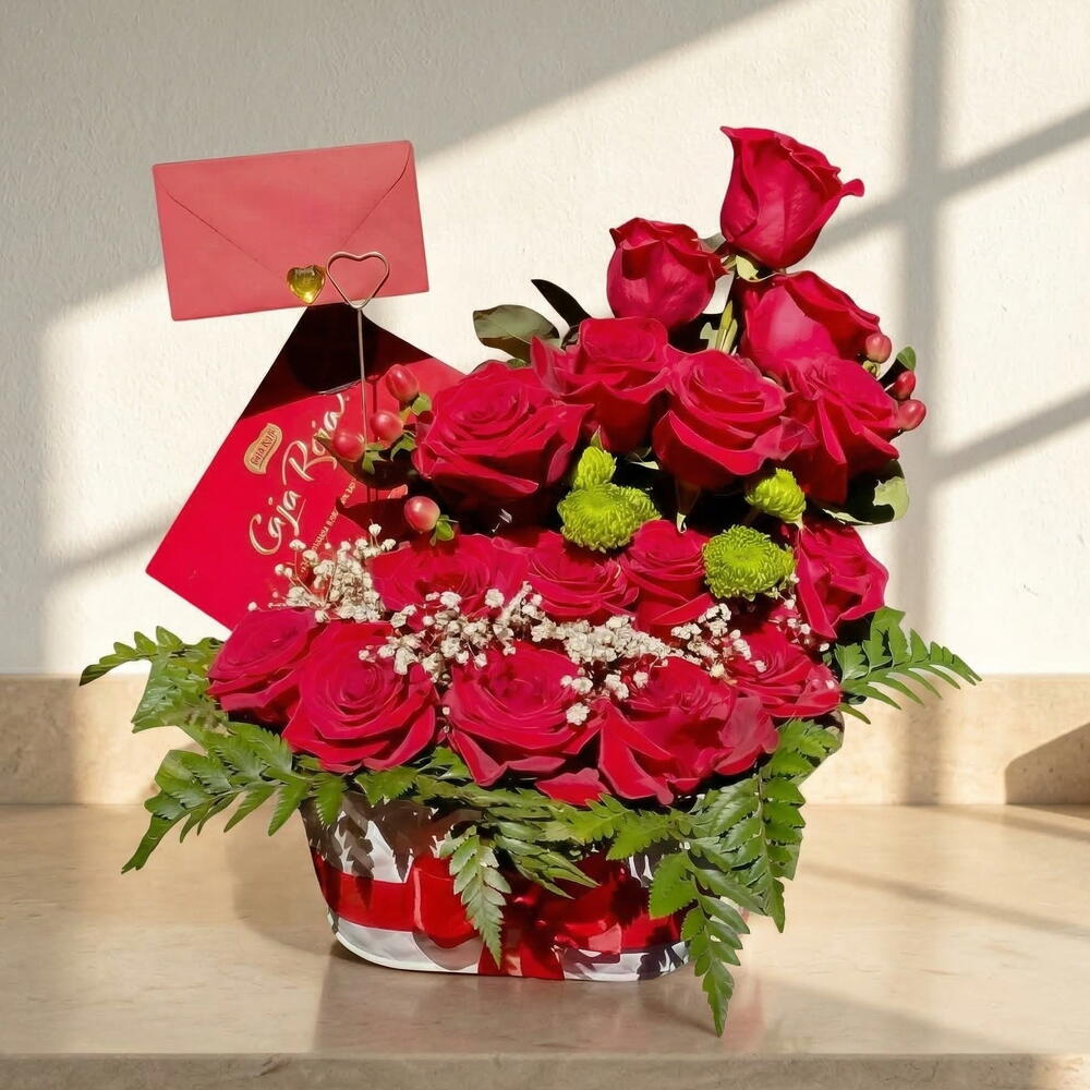 Эта прекрасная цветочная композиция с красными розами, нежной гипсофилой и зелёной ромашкой, дополненная красной коробочкой Nestlé, станет идеальным сюрпризом для особенного человека. Идеально подходит для таких случаев, как годовщина, День святого Валентина или любое другое романтическое торжество. Нотка шоколада добавит этой цветочной корзине неотразимой сладости. Инструкция по уходу: Чтобы цветы дольше оставались свежими, держите их в чистой, регулярно меняемой воде. Избегайте прямых солнечных лучей и сквозняков, чтобы они оставались свежими. Букет может стоять от 5 до 7 дней, в зависимости от ухода.