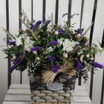 Statice - 10 шт. Limonium - 5 шт. Alstroemeria - 5 шт. Pistacia - 5 шт. eucalipto - 7 шт. колосья пшеницы - 9 шт. флористическая губка - 4 шт. бант из рафии - 1 шт. мини-гвоздика - 7 шт. винтажная корзина - 1 шт.