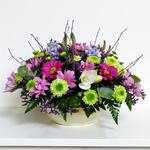 Гербера фуксия - 5 шт. лимониум фиолетовый - 3 шт. зеленые хризантемы - 3 шт. фуксиевые маргаритки и сирени - 3 шт. белые альстромерии - 3 шт.