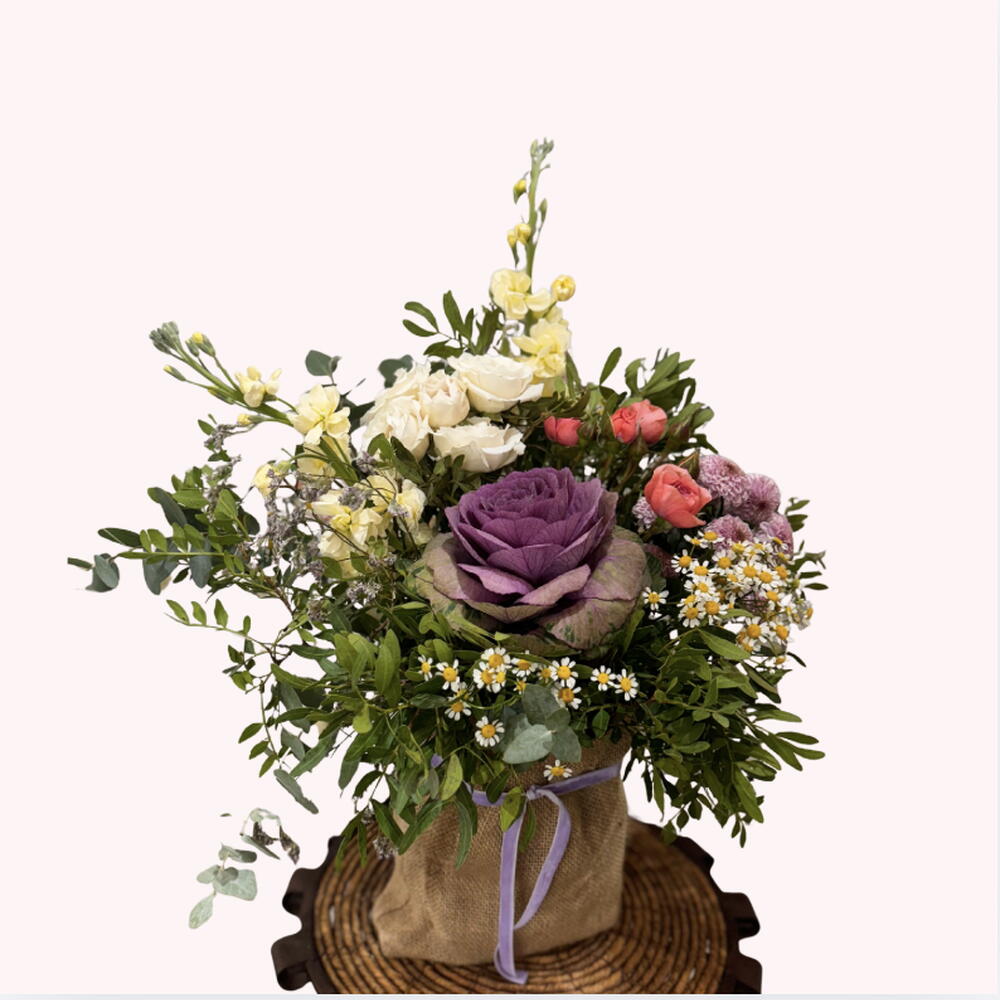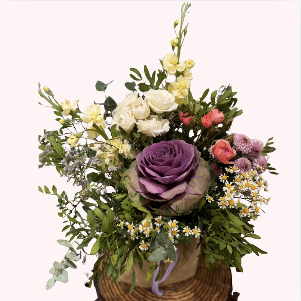 Композиция, полная природного очарования, где фиолетовая декоративная капуста становится главной героиней, каждая композиция выполняется вручную из свежих сезонных цветов. Представленная на основании, обтянутом натуральной тканью, она — идеальный вариант для подарка или для украшения в деревенском и элегантном стиле.