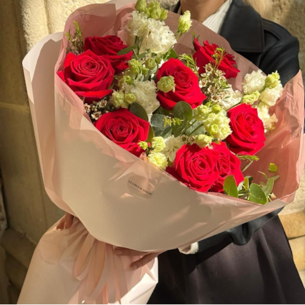 Este ramo de autor será un regalo perfecto para una persona especial. Se compone de 6 piezas de Lisianthus blanco, 3 flores de incienso de un verbo de cera, 7 piezas de rosas rojas apasionadas y 2 ramitas de eucalipto fragante. Esta deliciosa combinación de colores y aromas que te envuelven suavemente a TI y a tus seres queridos creará una atmósfera única de calidez y amor. Cada flor en un ramo habla por sí misma, tiene un significado y sentimientos profundos. Este ramo es como un poema escrito con colores, con el que puedes expresar tus sentimientos.