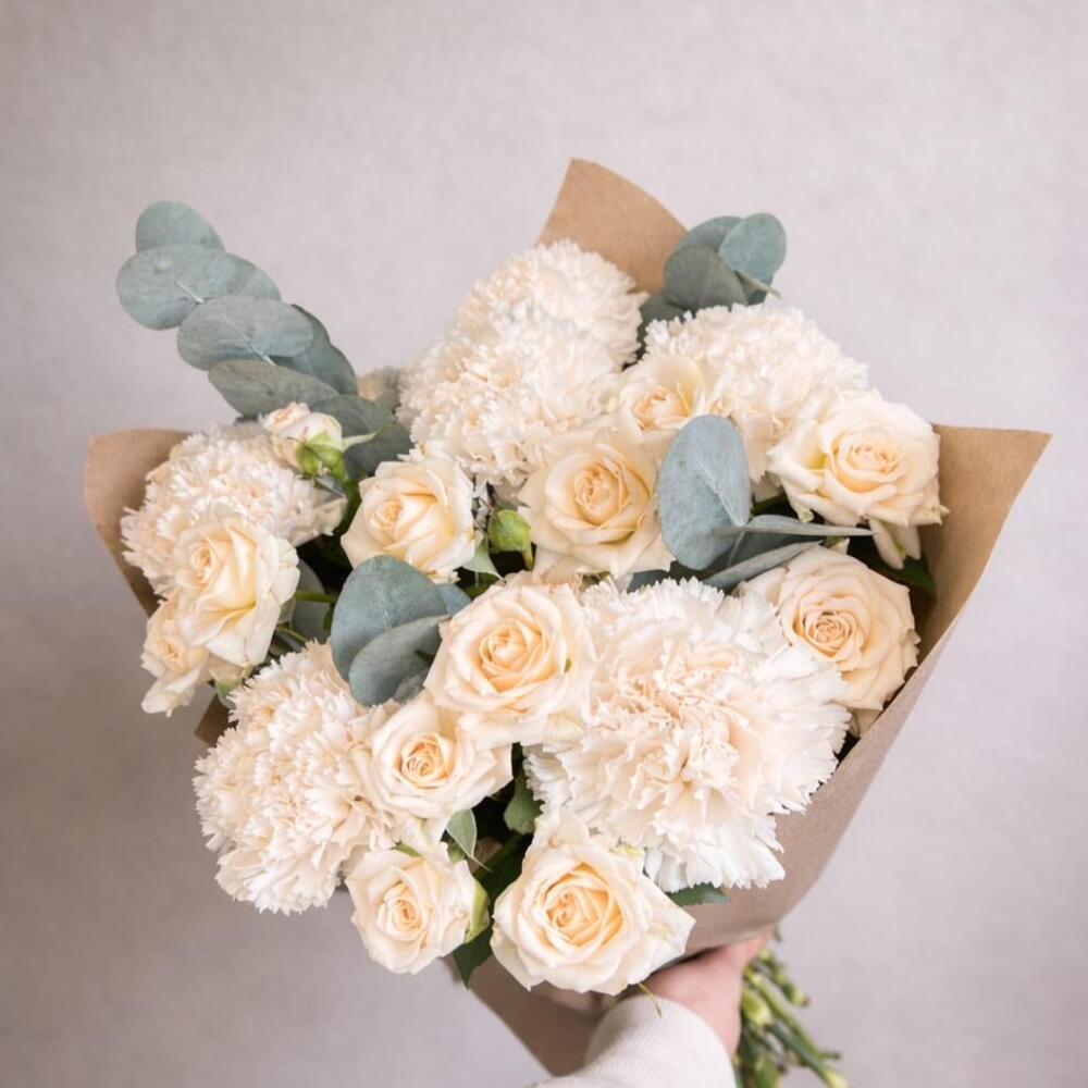 гвоздики и роза спрей среди мягкого эвкалипта