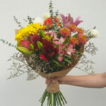 Этот яркий букет – идеальное сочетание тёплых и холодных оттенков, напоминающих о красоте заката. Красные и розовые лилии выделяются силой и элегантностью, а оранжевые хризантемы и жёлтые подсолнухи передают радость и жизненную силу. Оранжевые герберы и розовые альстромерии создают очаровательное, молодое настроение, уравновешенное безмятежностью белых роз. Зелёная листва и нотки эвкалипта подчёркивают естественность букета, придавая ему свежий и гармоничный стиль. Это идеальный подарок, чтобы отметить особые моменты, передать добрые пожелания или украсить любое пространство. Каждый цветок был тщательно отобран, чтобы обеспечить свежесть и визуальную гармонию.