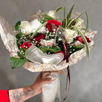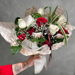 Un ramo sofisticado y delicado que combina la belleza clásica de las rosas rojas y blancas con detalles verdes y un toque especial de dulces. La gypsophila aporta ligereza y textura, mientras que los chocolates añaden un detalle encantador. Ideal para sorprender con elegancia y ternura.