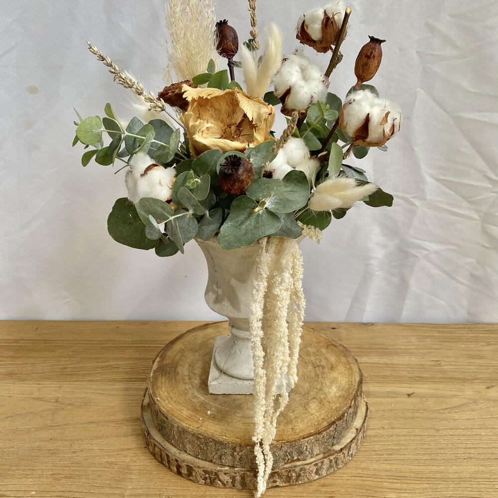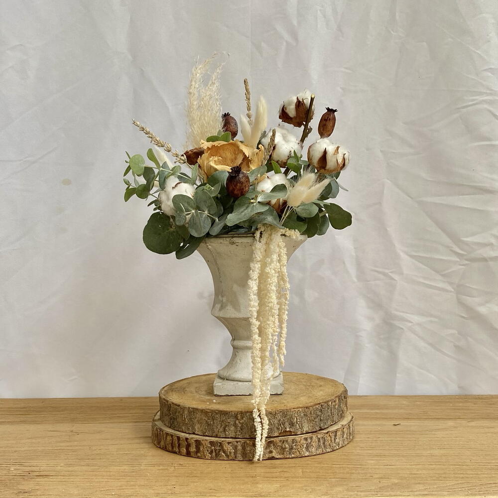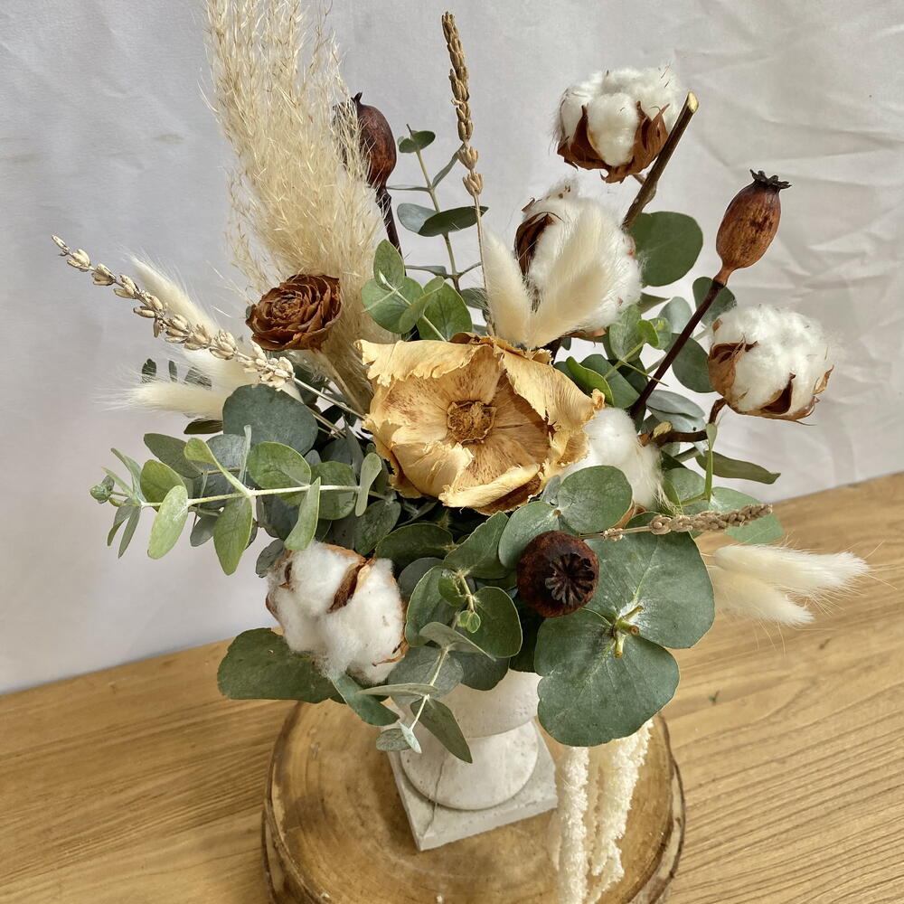 algodón - 1 шт. белый лагурус - 9 шт. эвкалипт цинерея - 1 шт. белый деревянный цветок - 1 шт. цветок из натуральной кедровой древесины - 1 шт. коричневый мак - 3 шт. белая лаванда - 3 шт. белый амарант - 1 шт.