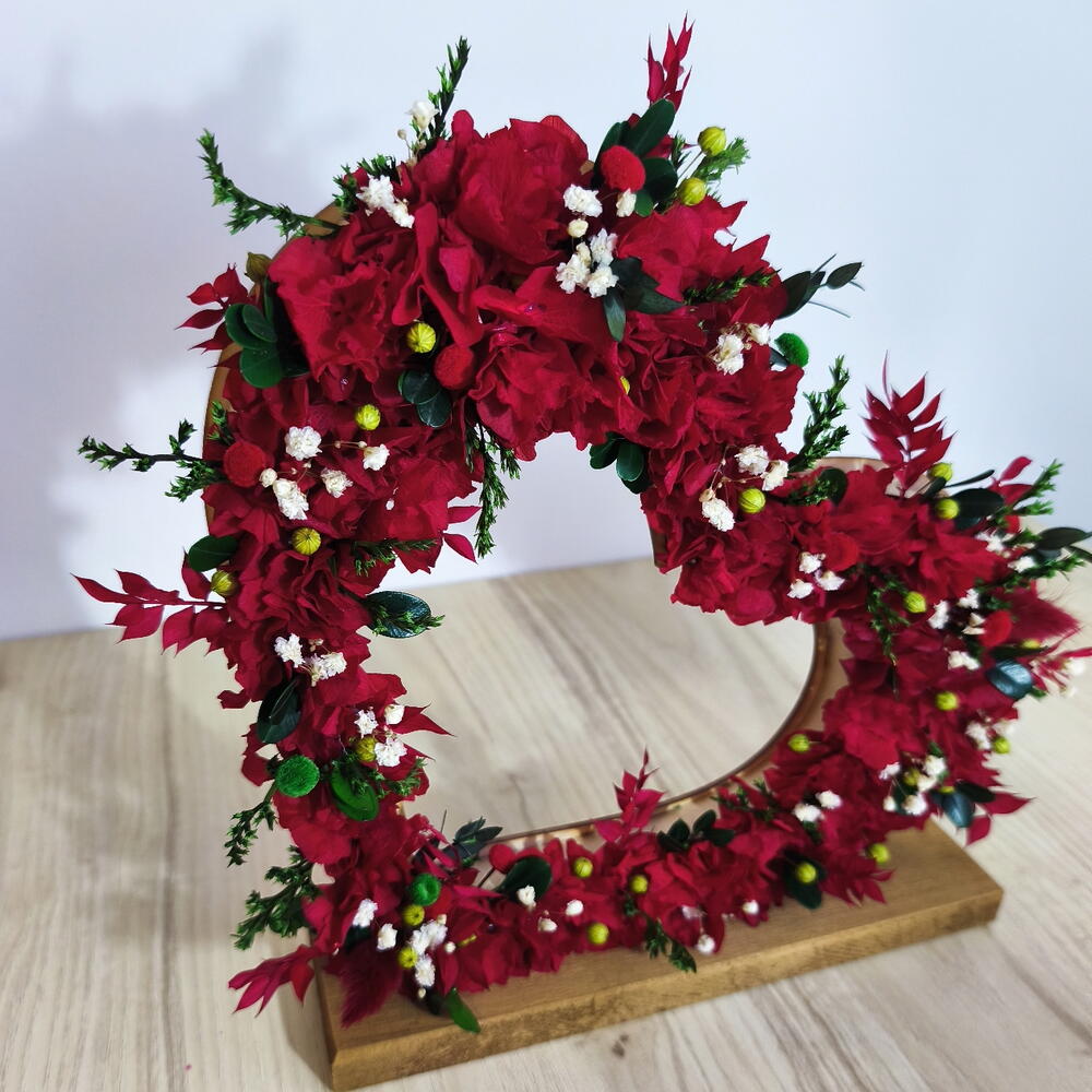 Интенсивно-красное цветочное сердце, выполненное из стабилизированных и сухих цветов, созданное для длительного сохранения без необходимости ухода. Её конструкция в форме сердца, смонтированная на основании из натурального дерева, придаёт визуальную лёгкость и современный дизайн. Идеально подходит в подарок на годовщины или как элегантное и долговечное признание. Каждое изделие выполнено вручную, с заботой о балансе объёма, текстуры и деталей. Подарок, который остаётся. УХОД Не требует воды. Хранить в помещении, вдали от влажности и прямых солнечных лучей. Избегать частых манипуляций.