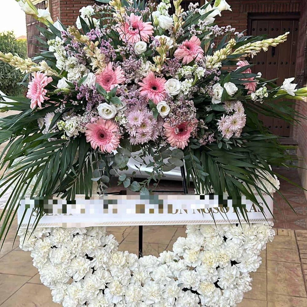 Этот величественный венок — шедевр классической флористики, созданный, чтобы воздать незабываемую дань миру и элегантности. Нижняя часть, плотно выполненная из безупречно белых гвоздик, символизирует чистоту и вечную любовь. В верхней части цветочная эксплозия поднимается из розовых гербер, белых гладиолусов и нежной пурпурной статицы, создавая яркий контраст, который олицетворяет жизнь и надежду. Акценты лизиантуса и хризантем добавляют слои текстуры и изысканности, а всё это обрамлено пышной подборкой пальм Робеллини, придающих архитектурную и торжественную структуру. Это произведение обладает сильным визуальным воздействием и идеально подходит для того, чтобы с достоинством выразить глубочайшие соболезнования.