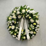 Белый траурный венок с лентой соболезнований