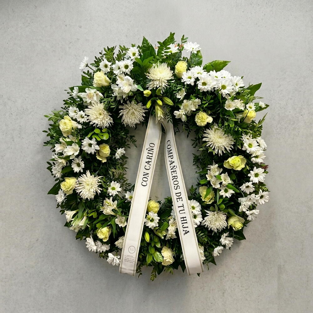 Классический и элегантный траурный венок, созданный из обильного количества белых хризантем, символа уважения и вечной памяти. Кремовые розы добавляют нежности и искренней любви, а бутоны лилий усиливают послание чистоты и духовного покоя. Гвоздики дополняют композицию объемом и изяществом. Лента с надписью «Соболезнования» добавляет глубокий эмоциональный смысл, делая этот венок идеальным выбором для траурного венка, композиции в знак сочувствия или цветов для особых случаев прощания. Баланс между белыми цветами и разнообразной зеленью создает гармоничную и безмятежную эстетику, делая эту торжественную цветочную композицию идеальным выбором для выражения уважения, памяти и почтения с помощью элегантного и значимого букета.